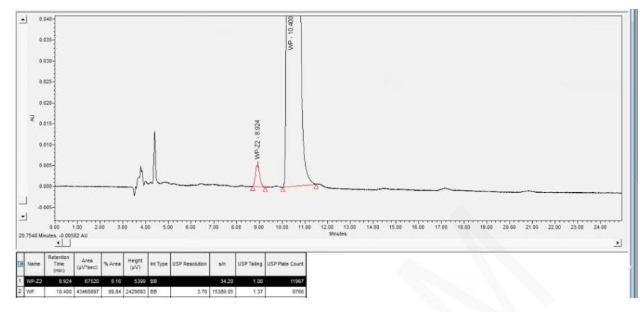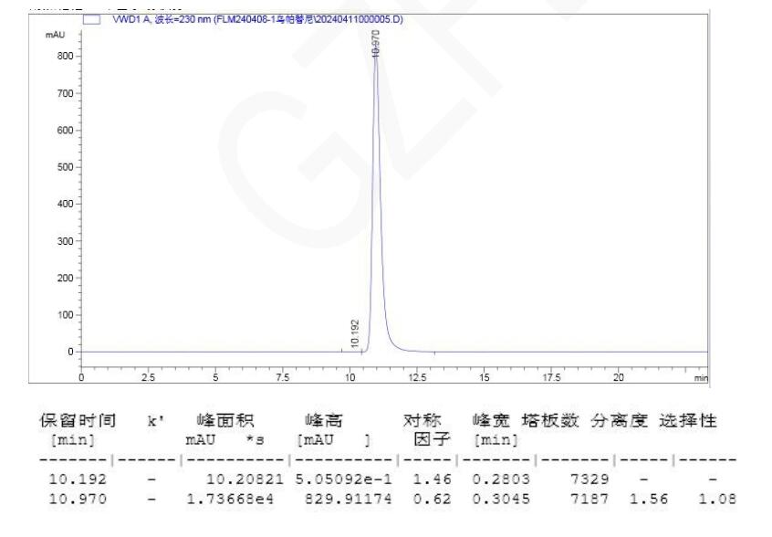 因此,為了確保烏帕替尼手性拆分的準確性和有效性,建議在專業(yè)的實驗室或藥物研發(fā)機構進行,并由具有相關經驗和技能的專業(yè)人員操作。這樣不僅可以確保拆分過程的順利進行,還可以保證拆分后得到的對映體的純度和活性滿足藥物研發(fā)和生產的需要。 App ID: FLM-B240004 烏帕替尼手性拆分 色譜柱:Chiral MZ(2)-RH 3μ 250*4.6mm (貨號:FMG-AC3-B02-R) 流動相:反相 (詳詢銷售代表) 流速:0.8 mL/min 檢測波長:230nm 柱溫:30℃ 樣品濃度:0.5mg/mL (異構體含量約 0.1%以下和異構體含量 0.15%) 稀釋劑(乙腈:水-30:70) 進樣量:10ul 色譜圖 1:(低于 0.1%限度)