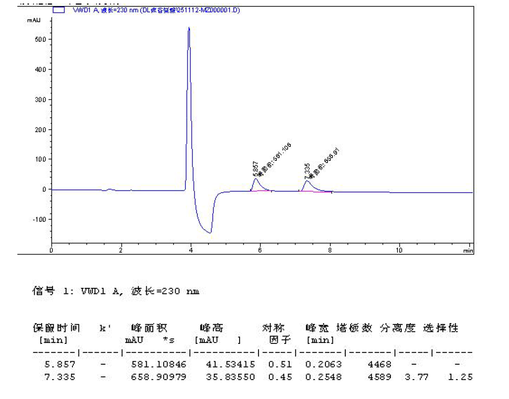 色譜柱:Chiral MZ(2) 5μm 250×4.6 mm 貨號:FMG-AC5-B02-NFC 流速:0.8mL/min 檢測:UV230nm 樣品濃度:1 mg/mL 進(jìn)樣量:2 μ 流動相:咨詢