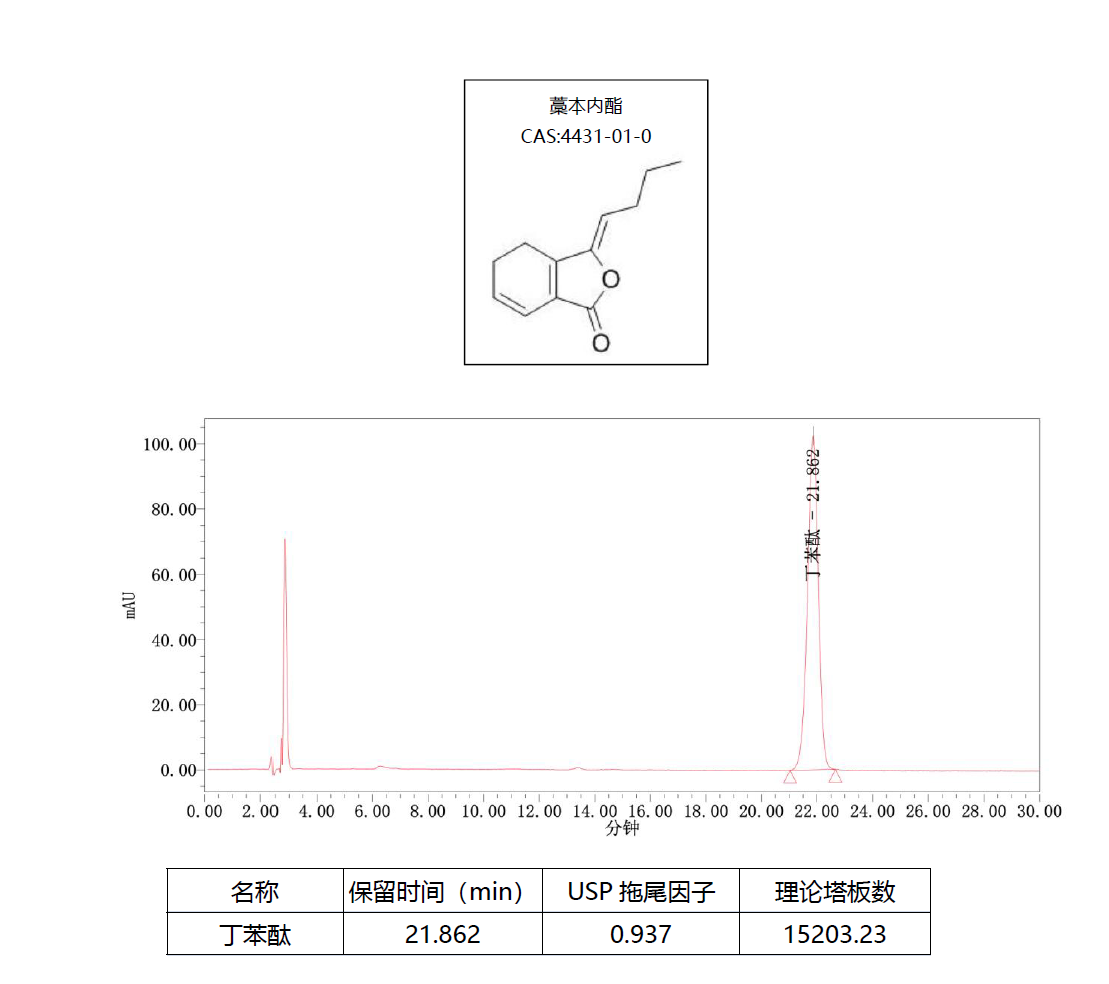 評價:藥典要求丁苯酞峰理論塔板數(shù)高于3000,藁本內(nèi)酯色譜峰與丁苯酞色譜峰相對保留時間1.67 ± 5% ( 34.69min-38.34min ) , 以上要求非常挑柱。經(jīng)多柱篩選, 采用Titank C18-Plus 5u 250*4.6mm 色譜柱,藁本內(nèi)酯出峰35.84,符合要求,且理論塔板數(shù)遠高于藥典要求。 |